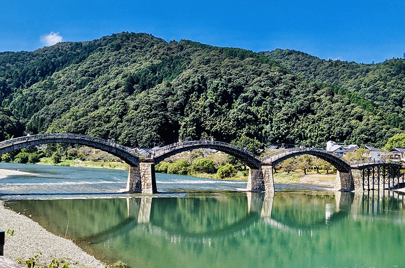 錦帶橋位於山口縣岩國市,錦帶橋是聞名日本的三大奇橋之一,橫跨於山口縣境內的第一大河--錦川。橋身長約210公尺、寬5公尺、高6.6公尺,早在1673年,第三代岩國藩藩主吉川廣嘉所建造時,就全橋使用木製材料,並採用複雜的組合式建造技法,完全沒使用一根釘子。不過由於颱風來襲,錦川洪水暴漲兩度沖毀橋身,後來看到的錦帶橋是市民合力修復的成果。現在錦帶橋的基樁改用石頭,而橋身仍是保持木製材料。錦帶橋五連的拱橋造型,就像是綿延的錦帶,不難發現其匠工之精細,構造之複雜。無論是白天或是夜晚,橋身倒映在粼粼的水面上,伴隨沿岸櫻花及相望的岩國城,不同角度和時間都有不同的風味。