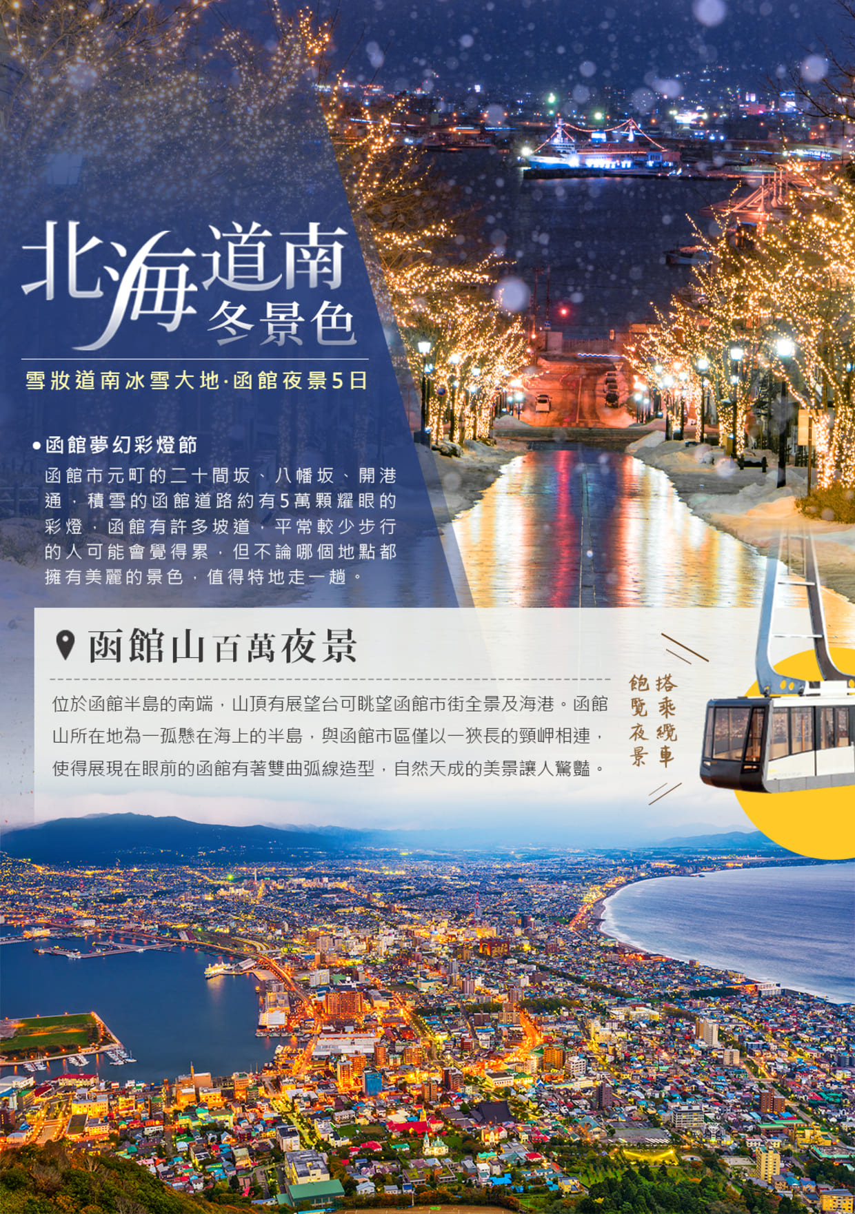*【函館夢幻彩燈節】日期時間僅供參考,主辦單位保有變更取消之權利。另因住宿飯店調整或車時限制或其它不可抗拒之現象而取消前往不退費,行程安排以當地為主,敬請諒解。