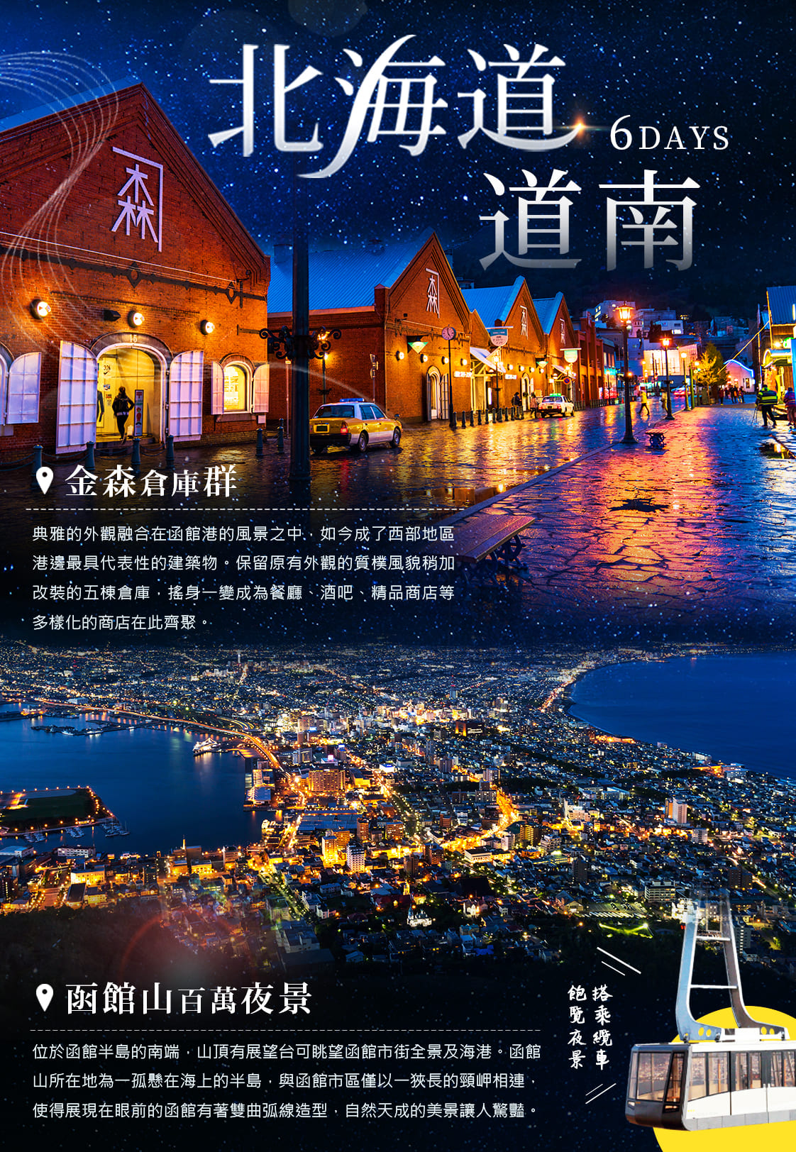 *如遇函館空中纜車年度維修、天候或其他不可抗力因素而無法搭乘時,則改搭巴士上山,且每人退費團體料金大人(含佔床小孩)1800日幣、不佔床小孩900日幣、嬰兒不退費。(若因天候或路況限制以致巴士也無法上山,在安全優先考量下,僅退費不上山賞景,敬請見諒)