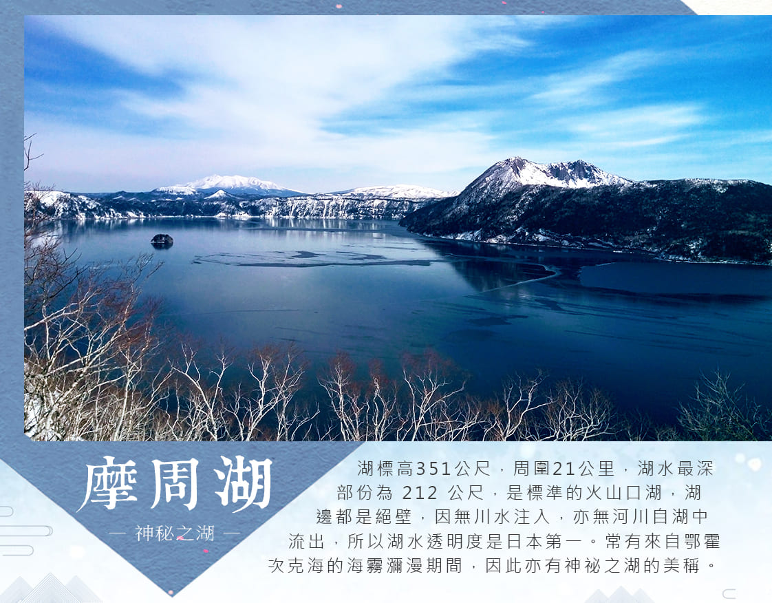 以雲霧瀰漫出名,透明度稱得上是世界屈指可數的神秘之湖,摩周湖屬於阿寒國立公園的一部分,比阿寒湖稍大些,周長20公里、最深21公尺、面積19.6平方公里,在十大觀光景點中名列前茅,備受歡迎。是標準的火山口湖,湖邊都是絕壁,因無川水注入,亦無河川自湖中流出,湖水透明度是日本第一。湖水的透明度曾於1931年測出為41.6公尺。因為湖水透明幾乎不含雜質,宛如藍帶一般的獨特深青色湖泊被稱做「摩周的藍寶石」。2001年被選為北海道遺産。