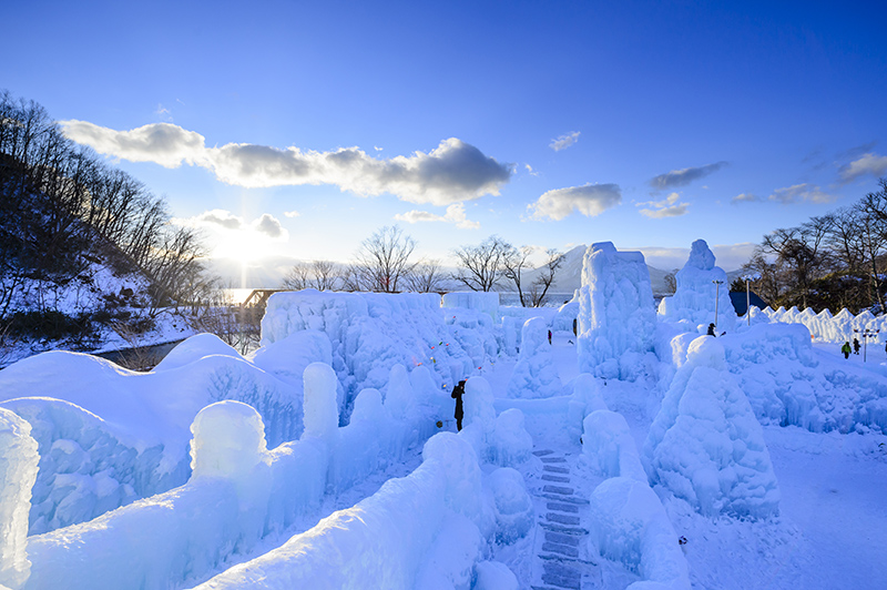 是層雲峽溫泉冬季大型活動,令人震撼的冰瀑林立會場,充滿震撼力的冰柱、冰隧道、還有高達15公尺高的冰製展望台等,層雲峽嚴冬自然力量所形成的各式冰製建築林立眼前,可說是只有北海道才可能體驗的慶典。夜晚燈光打照在冰製建築上,產生與白天截然不同的夢幻氣氛。活動期間還有舉辦觀光客可輕鬆參加的遊戲大會、煙火大會等。從會場步行約3分鐘,即可抵達層雲峽溫泉街。盡情享受嚴寒才有的祭典後,在溫泉中悠閒地溫暖身軀吧!