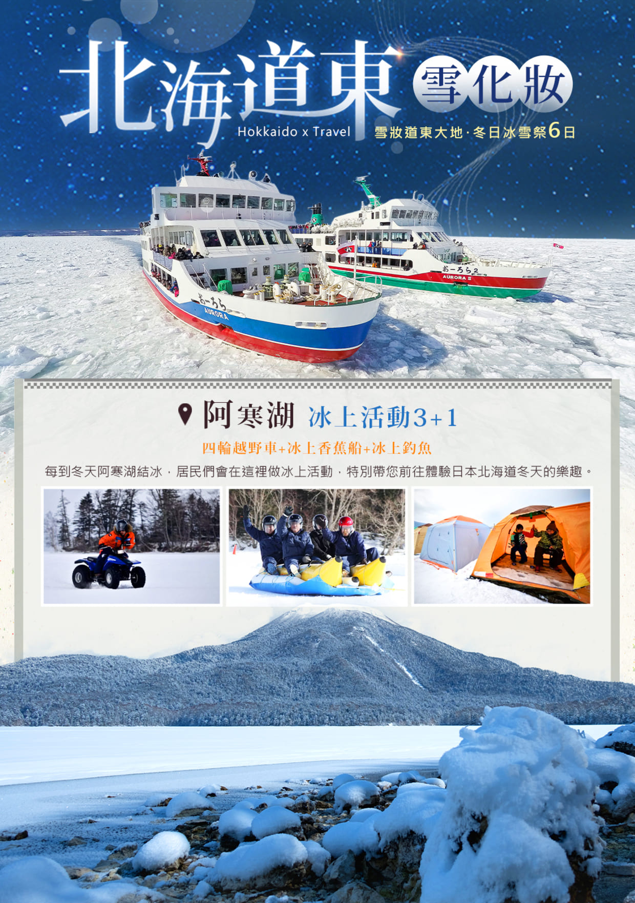 *【阿寒湖冬華美冰上嘉年華】日期時間僅供參考,主辦單位保有變更取消之權利。另因住宿飯店調整或車時限制或其它不可抗拒之現象而取消前往不退費,行程安排以當地為主,敬請諒解。