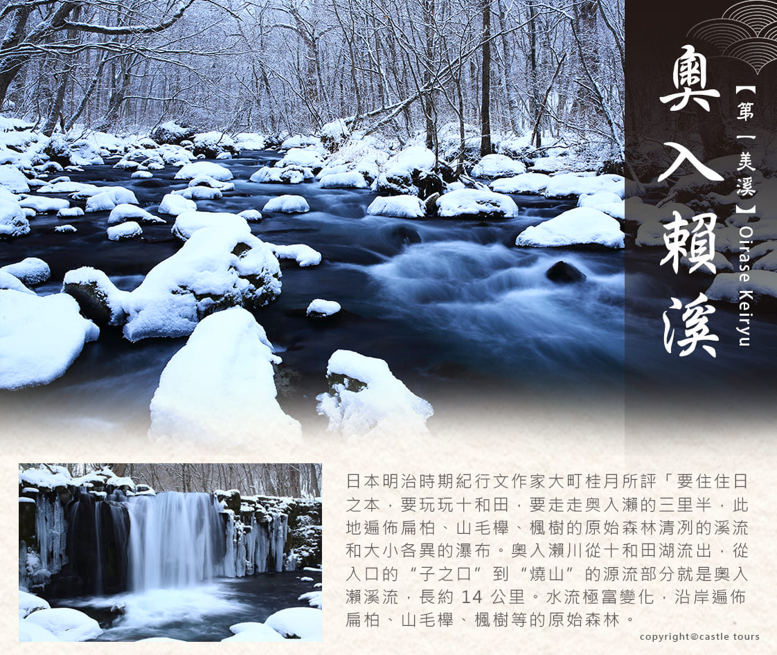 日本明治時期紀行文作家大町桂月所評「要住住日之本,要玩玩十和田,要走走奥入瀨的三里半(三里半相當於現在的14公里)」,此地遍佈扁柏、山毛櫸、楓樹的原始森林清冽的溪流和大小各異的瀑布。奧入瀨川從十和田湖流出,從入口的“子之口”到“燒山”的源流部分就是奧入瀨溪流,長約14公里。水流極富變化,沿岸遍佈扁柏、山毛櫸、楓樹等的原始森林。它與十和田湖同被指定爲青森縣的特別名勝和天然紀念物。沿溪流漫步,可一路欣賞身邊的自然美景。這裏有蒼鬱茂密的大樹,飛濺的水珠,還有浮在水面上的蘚苔和藤蔓纏繞的岩石,真是美不勝收。奧入瀨溪流沿途大大小小的各種瀑布也值得一看。共有銚子大瀑布、九段瀑布、不老瀑布、雙龍瀑布等14個著名瀑布。每個瀑布都有其特色與看點,所以其步道又稱為「瀑布街道」。其中以寬約15公尺、落差7公尺,也是奥入瀨溪流本流中唯一的瀑布銚子大瀑布規模最大也最具代表。其水量之大,形成一個壯觀的景觀,展現了特色各異的風姿。另外豐富的水流變化,締造出美麗的溪流之美,而每個溪流都依激流的型態來命名,如阿修羅之流,飛金之流,白銀之流,萬兩之流等。