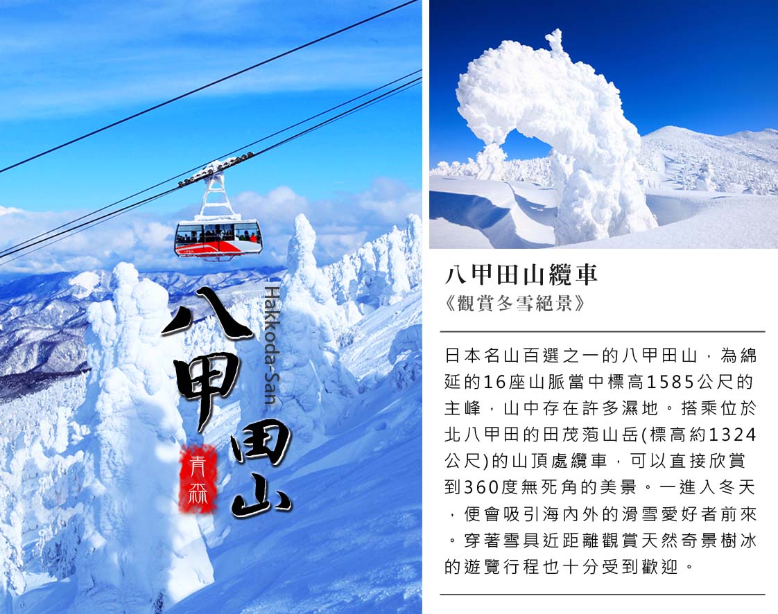 位於青森縣的八甲田山纜車,是欣賞四季美景的最佳方式。纜車自山麓站直達海拔1,314公尺的山頂公園站,短短10分鐘即可展開壯麗視野。秋季滿山紅葉如火,冬季則能見到壯觀的「樹冰」奇景,被譽為雪之怪物的自然藝術。春夏時節,山頂步道適合健行,綠意盎然。纜車車廂寬敞,可容納百人,乘坐舒適。無論是追尋紅葉、雪景或清新山風,八甲田山纜車都能帶來震撼的自然體驗,是青森旅遊不可錯過的亮點。