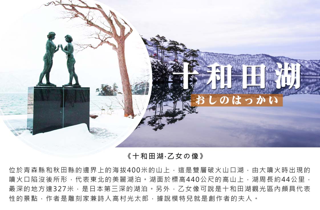 十和田湖位於青森縣和秋田縣的邊界上的海拔 400 米的山上,這是雙層破火山口湖,由大噴火時出現的噴火口陷沒後所形,代表東北的美麗湖泊。湖面於標高440公尺的高山上,湖周長約44公里,最深的地方達327米,是日本第三深的湖泊,而且透明度高。岸邊斷崖很多,陡峭的好像岸上的樹木都要落到湖裡似的。春來一片新綠,秋天滿山紅葉,冬有北國雪景,碧綠清澈的湖水映出這些各具特色的四季應時的自然風貌,充滿神秘美感,每年春秋兩季是此地最美的時節,春天的新綠和秋天的紅葉,配合上十和田湖的遠離塵囂、幽靜閒適的環境,為遊客帶來完美的旅遊享受。