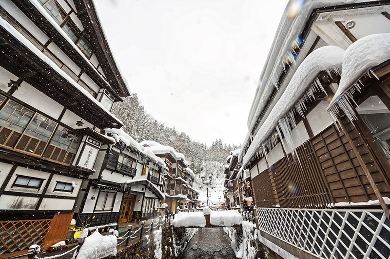 山形縣尾花澤市內有一座沿著銀山川溪谷的銀山溫泉,銀山川清冽的河水冒著熱氣穿流其中,這裏有成排的3、4層樓木結構的旅館,氣氛寧靜,宛如世外桃源。500多年前這裏發現了銀礦,所以這座溫泉村取名爲“銀山”,人們來到這裏總會産生一種錯覺,以爲到了拍攝日本古代戲的電影村。銀山溫泉保留了大正到昭和初期的木造洋房,復古的街景和白雪皚皚的冬日雪景,充滿浪漫的氣息。銀山溫泉也是風靡全世界的日本電視劇【阿信】的舞台。另有傳說日本動畫《神隱少女》中的湯屋也是來自該地的靈感,溫泉旅館林立的復古浪漫氛圍,搭配唯美的雪景,每年吸引來自各地旅人。