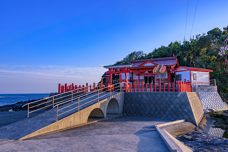 是日本知名的「Power Spot」之一,號稱到訪此地能讓人充滿能量靈氣。神社位在可遠眺薩摩富士開聞岳的海邊,佔地雖然不大,但據說參拜後就會有好運和幸福降臨,加上附近景色優美,所以不時會有遊客專程來此祈福。