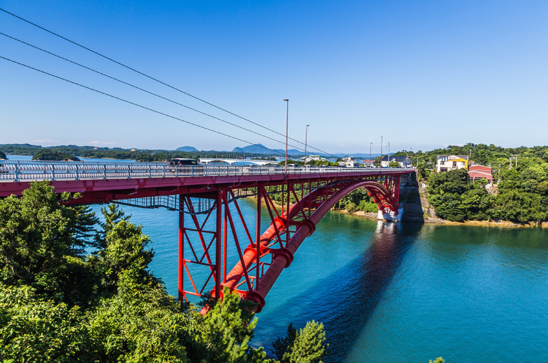 1966年(昭和41年)9月正式開通,全線12km的天草五橋由五座橋樑所組成,它連接了九州本土與天草諸島。又稱為「天草珍珠線」的天草五橋分別是1號橋(天門橋)、2號橋(大矢野橋)、3號橋(中橋)、4號橋(前島橋)、5號橋(松島橋)。天草五橋能順利建造完成,最大的功臣是森茲秀氏。多虧了他始終沒放棄在天草架設五座連接陸地的橋梁的夢想。如今,這裡成了天草的經典觀光景點,人氣的兜風路線。