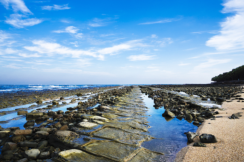海岸線有著相當奇特的景觀,像是平緩開闊的階梯朝著相同的方向呈現水平線,形成不可思議的地形。這種被稱為波狀岩的景觀是1500百萬~3000萬年前從海中浮出隆起的砂岩和泥岩所累積的地層,長年累月受到海浪擊打侵蝕所打造出來,形狀看起來又像是洗衣板,所以又被稱為鬼之洗衣板。