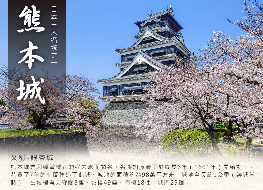 熊本城為加藤清正受封為熊本城主後於1601開始動工;1607年完工的日本三大名城之一。熊本城規模壯觀,是其牢不可破、堅不可摧的名城,其中以稱為「倒武者」的石牆最為出名。城內有許多銀杏樹,所以別名銀杏城,然於今年地震時遭受嚴重損害,目前已大致修護完成,返回往日風采。