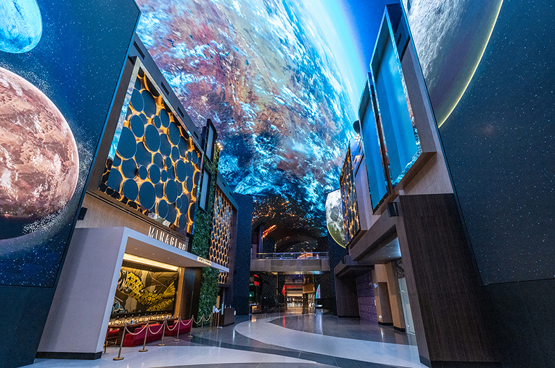 是一個將媒體藝術用最先進的IT技術、現場表演、餐廳、酒吧和零售店連結未來主義的娛樂空間。長達150米的巨幅LED顯示屏覆蓋著高聳的天花板和牆壁,營造出超現實的場景效果。高清的LED和柱狀LED直衝雲霄,示範引人入勝的數位內容,讓你沉浸在似真似幻的另一個世界中。森林的高空草叢中,轉眼間,彷彿又沉浸在碧藍的深海深處。