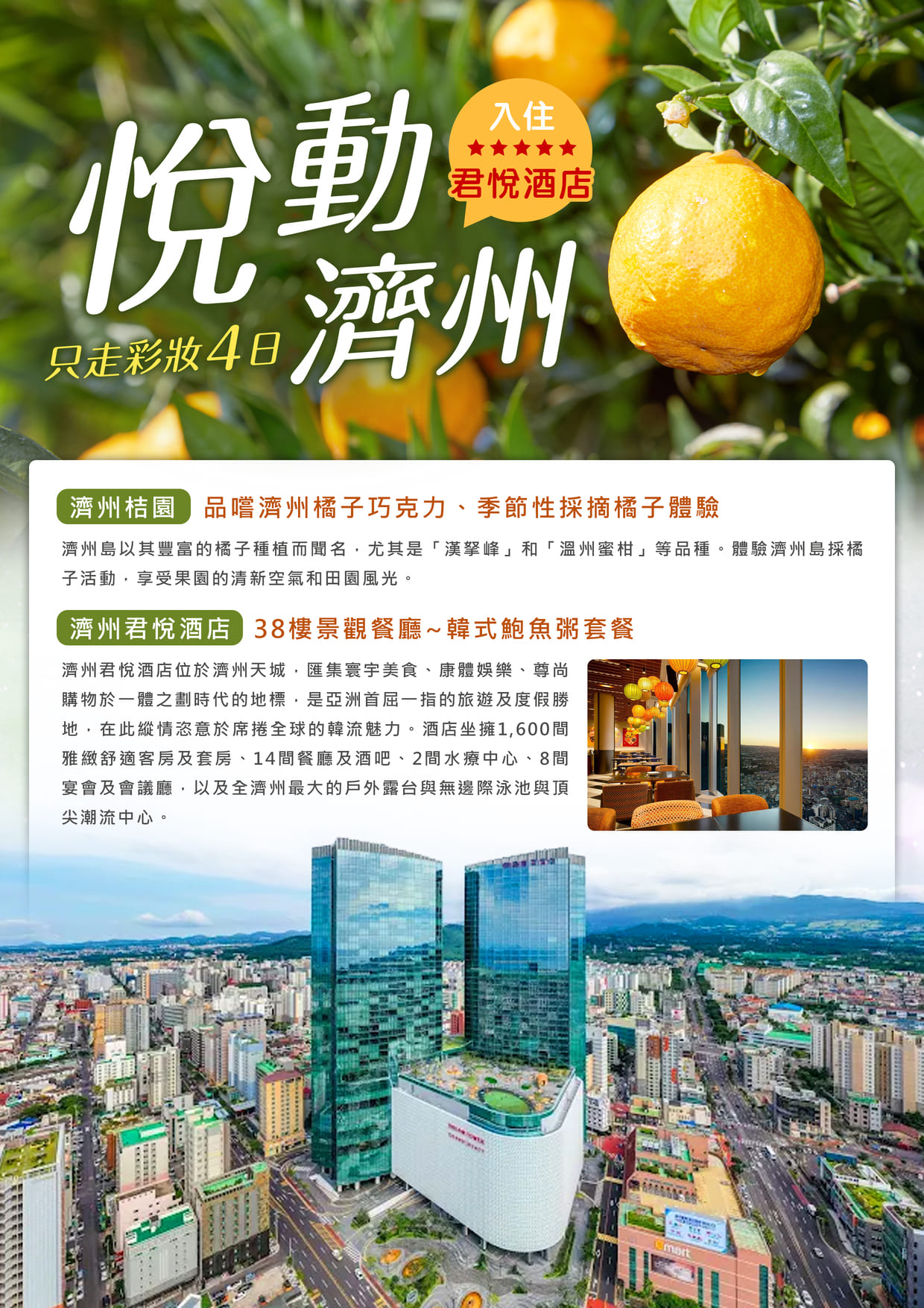 住宿:國際五星★★★★★濟州君悅飯店GRAND HYATT 或同等級
