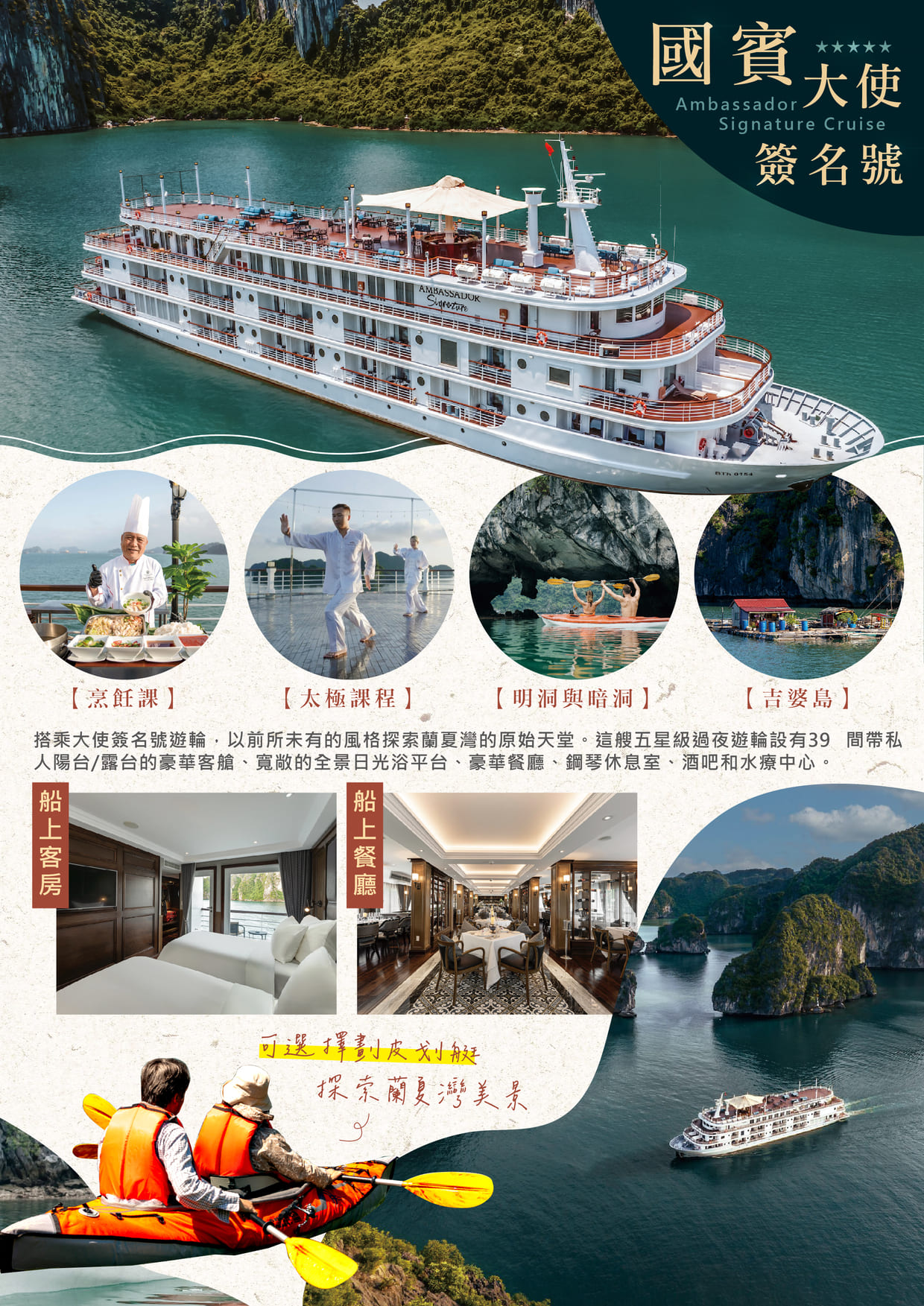 ★Ambassador Signature Cruise國賓大使簽名號:搭乘大使簽名號遊輪,以前所未有的風格探索蘭夏灣的原始天堂。這艘五星級過夜遊輪設有39 間帶私人陽台/露台的豪華客艙、寬敞的全景日光浴平台、豪華餐廳、鋼琴休息室、酒吧和水療中心。一流的設施、優質的亞洲-歐洲美食和卓越的娛樂活動完美融合,保證為乘客帶來有史以來最崇高的奢華旅程。
