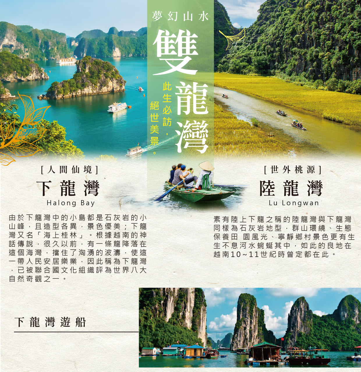 ◆陸龍灣:素有陸上下龍之稱的陸龍灣與下龍灣同樣為石灰岩地形,群山環繞、生態保養、田園風光、寧靜鄉村景色更有生生不息河水蜿蜒其中,如此的良地在越南10~11世紀時曾定都在此。