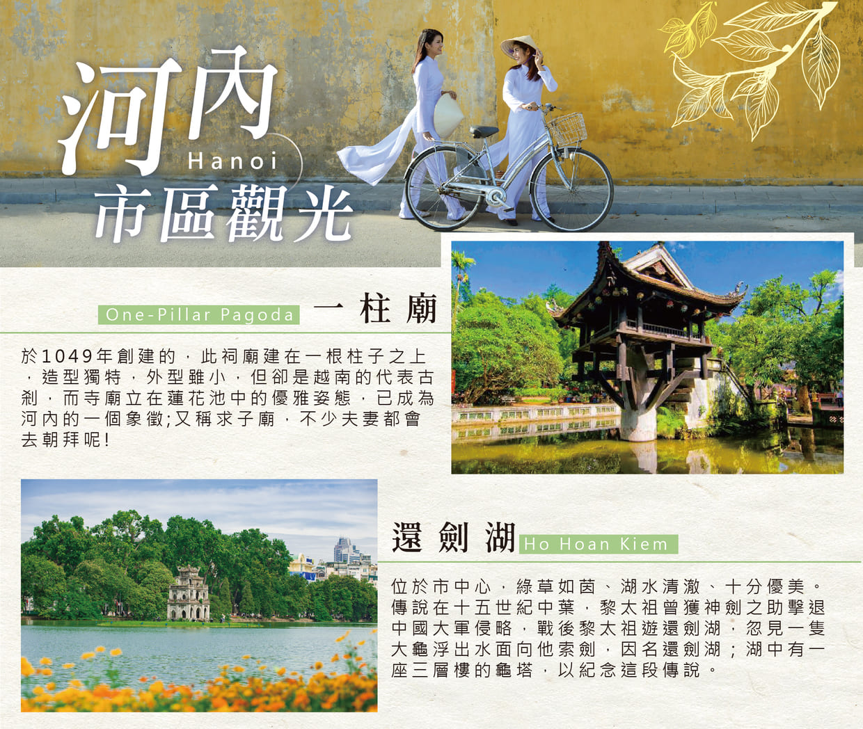 ※注意事項:河內市區觀光(巴亭廣場、胡志明陵寢、主席府、胡志明故居、一柱廟、西湖-鎮國寺、文廟等景點,不能穿短褲、短裙、無袖的衣服,如要穿短褲必須要過膝)。