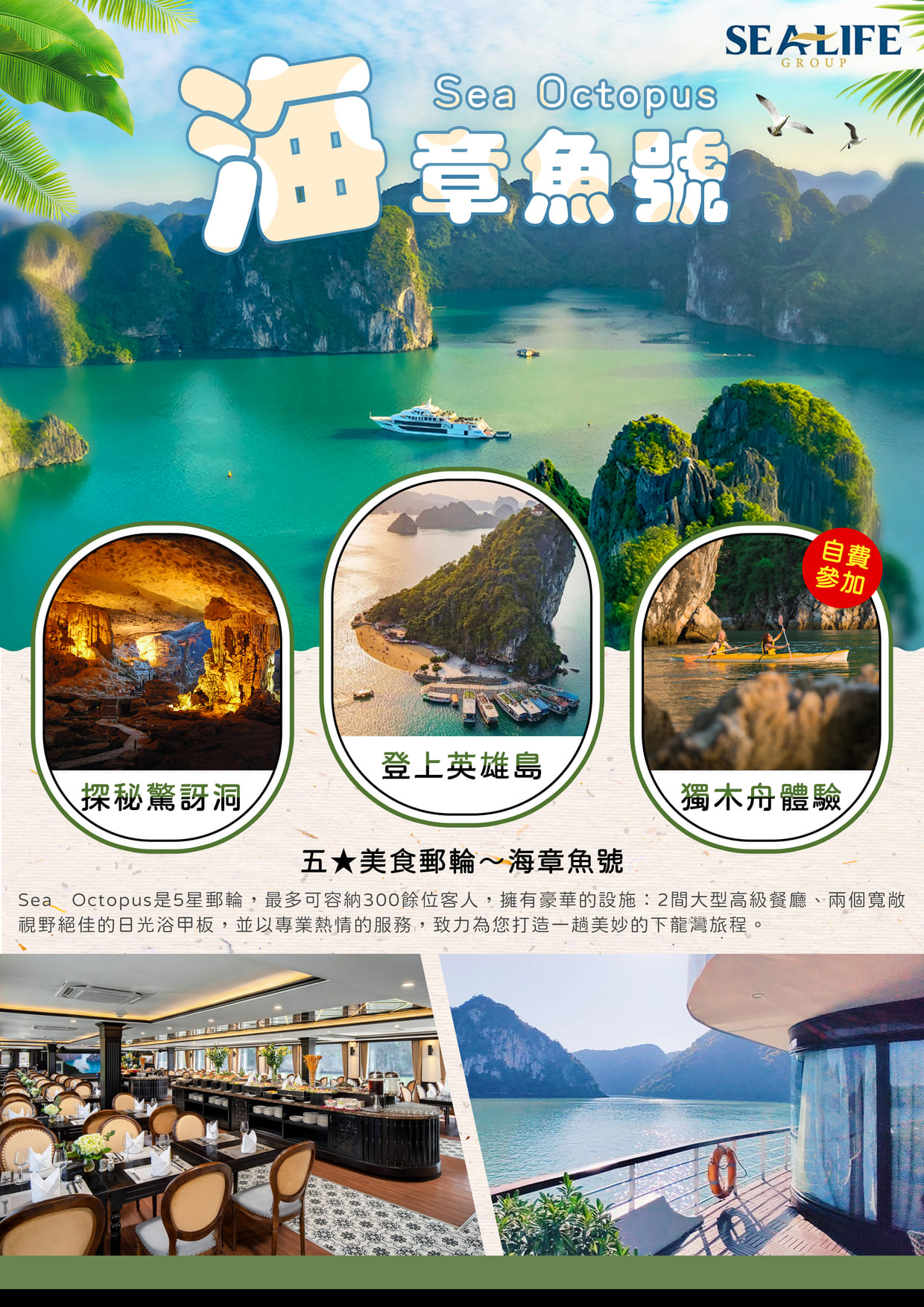 ◆Sea Octopus海章魚號:Sea Octopus是5星郵輪,最多可容納300餘位客人,擁有豪華的設施:2間大型高級餐廳、兩個寬敞視野絕佳的日光浴甲板,並以專業熱情的服務,致力為您打造一趟美妙的下龍灣旅程。